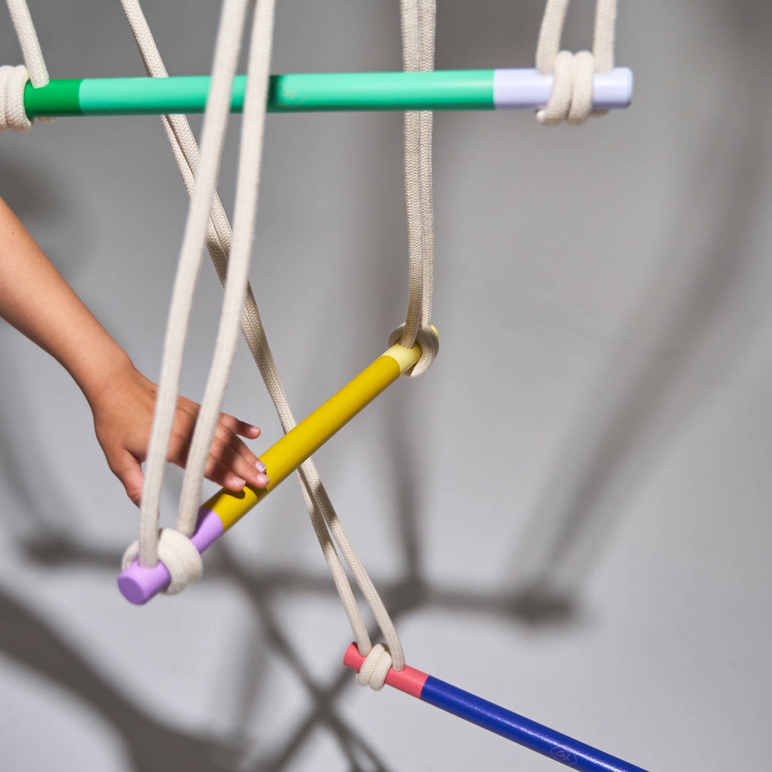 Material: handbemaltes Sperrholz und Buchenholz, Baumwollseil